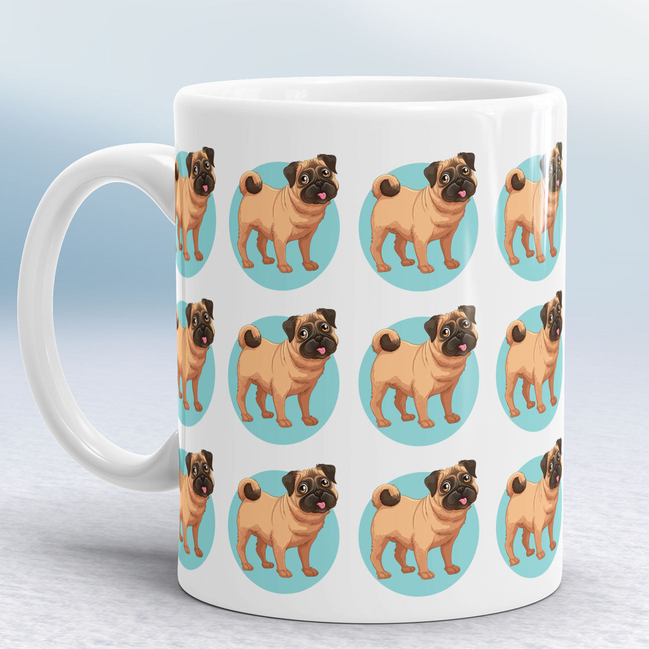 Keramická šálka ručne potlačená farebnou grafikou mopslíka po obvode. Vysoko kvalitná ručná potlač. Šálka je vhodná do umývačky riadu.